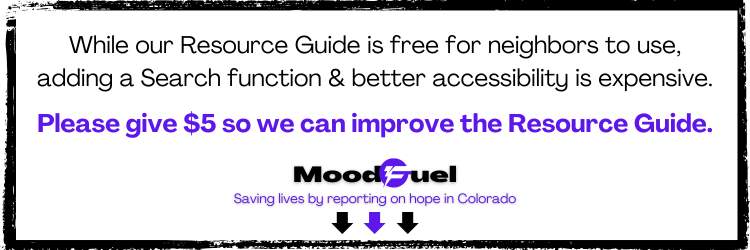 The Moodfuel Resource Guide provides links to learnings, listeners and supportive content to help you navigate Colorado's rocky terrain of mental health. We want neighbors to know that mental health is achievable and support is available, so we update and improve our guide continually.